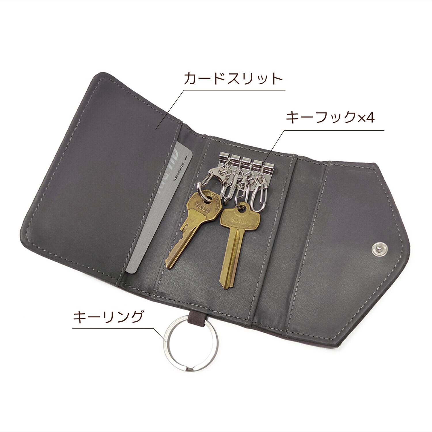 内部には4連キーフックとカードスリットを備え、背面にもカードスリットを備えています。